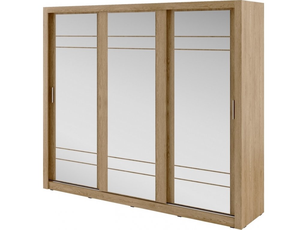 CASA 73002 Šatní skříň třídveřová s posuvnými dveřmi v moderním provedení. Korpus a dveře jsou z kvalitního LTD v barvě dub shetland. Dveře jsou osazeny zrcadlem. Uspořádání polic viz. menší obrázek. Hrany u skříně jsou ohraničeny ABS páskou. LED osvětlení lze dokoupit. Dodáváme v demontovaném stavu.