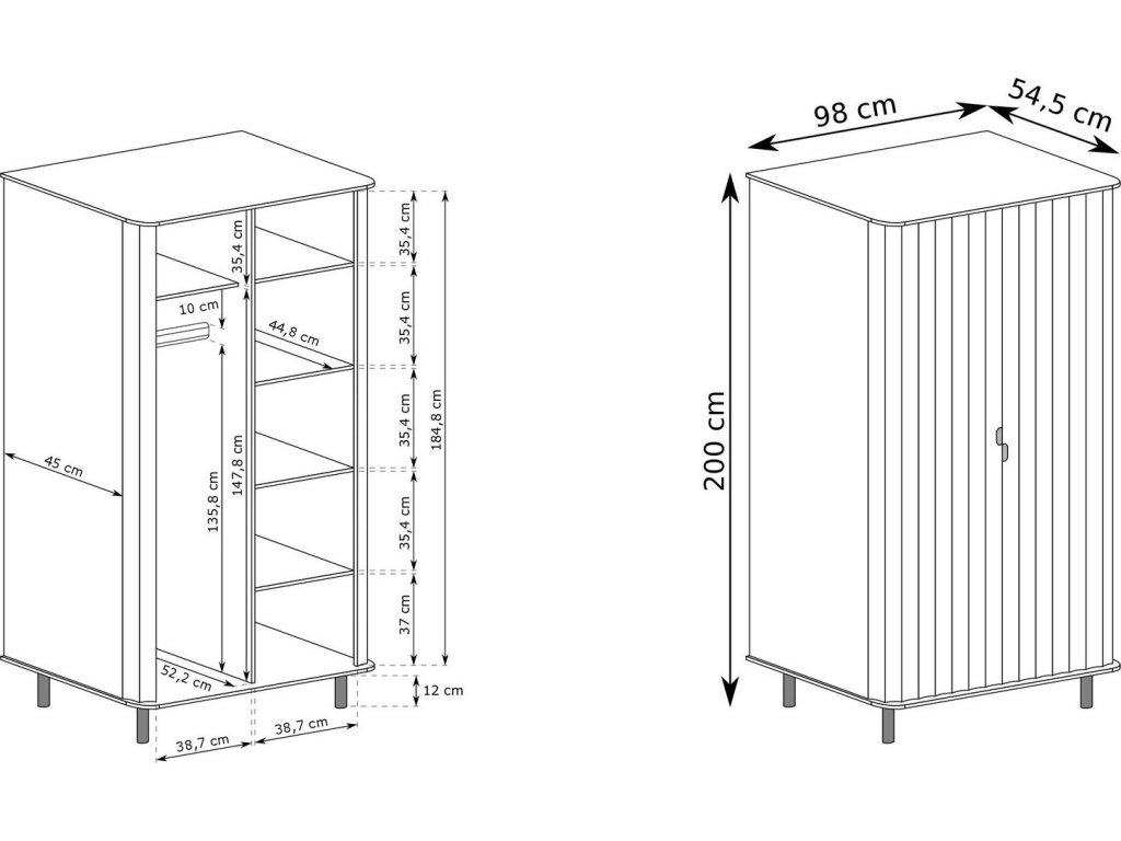 Díky dvou skříňkám s vnitřními policemi a šatní tyčí budete mít ve věcech konečně pořádek. Kvalitní výsuvy (soft close) a panty s tichým dovíráním se postarají o každodenní komfort. Rozměry viz obrázek.
