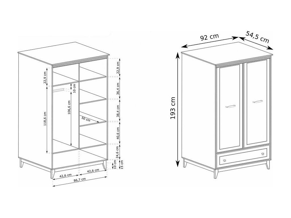 Díky jedné prostorné zásuvce a dvěma skříňkám s vnitřními policemi a šatní tyčí budete mít ve věcech konečně pořádek. Kvalitní výsuvy (soft close) a panty s tichým dovíráním se postarají o každodenní komfort. Rozměry viz obrázek.
