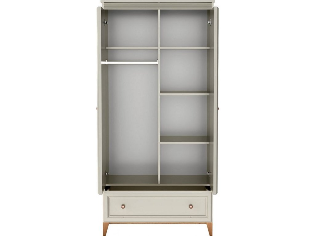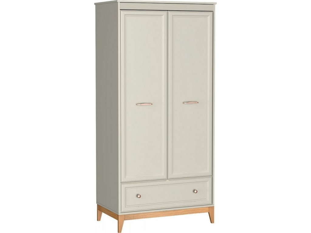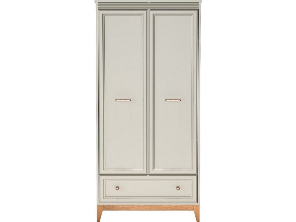 Skříň podepírají nožky z masivního dubového dřeva o výšce 15 cm, které jsou pevné a stabilní. Odolné laminované desky u korpusu a MDF deska u frontu (čela) nábytku s ABS hranami přispívají k dlouhé životnosti. Úchyty jsou kovové měděné barvy.
