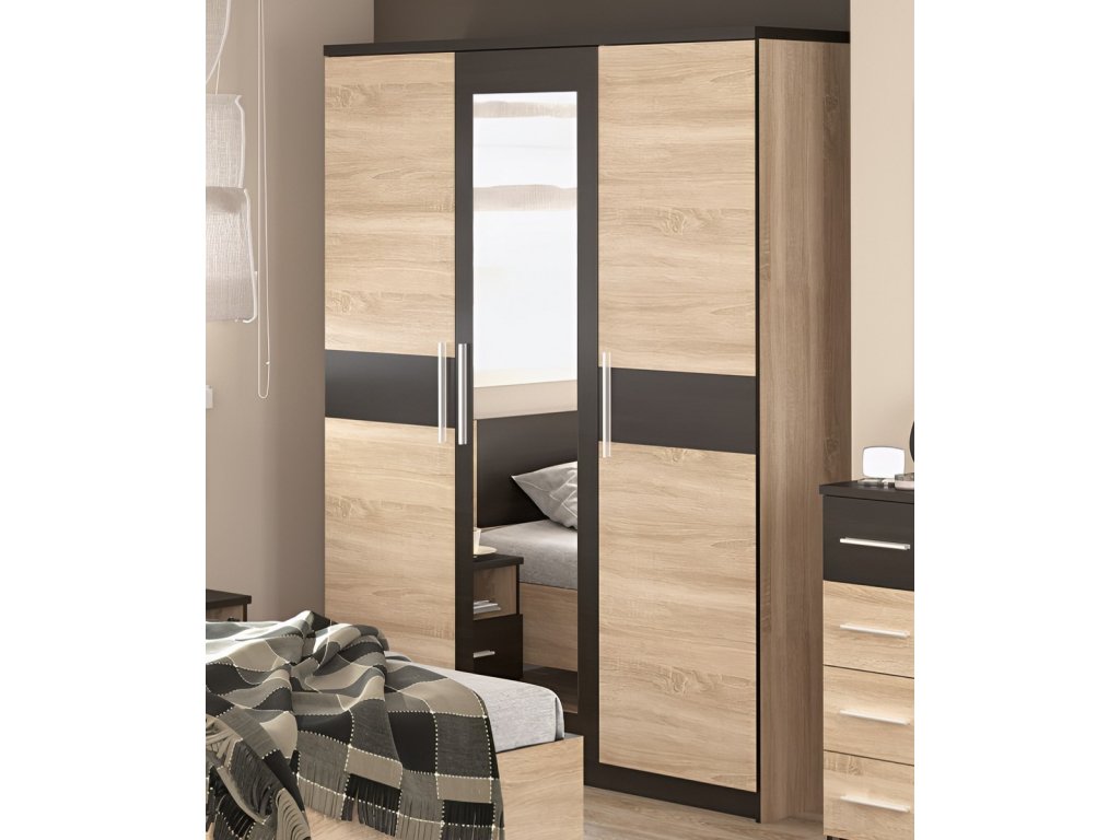 CASA 97003 Šatní skříň třídveřová s z ložnicové řady. Moderní provedení v kontrastních barvách dokonale doplní váš interiér. Šatní skříň je vyrobena z kvalitní LTD desky v barevné kombinaci dub sonoma/wenge. Skříň obsahuje uprostřed praktické zrcadlo. Nabídka komponentů této sektorové řady umožňuje sestavit si nábytek do ložnice nebo studentského pokoje dle vlastních představ. Dodáváme v demontovaném stavu.