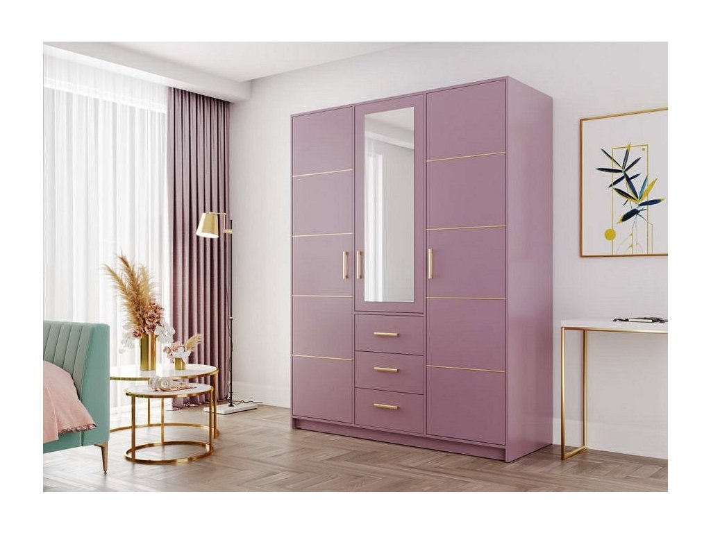 CASA 31004 Šatní skříň 3-dveřová v moderním provedení. Korpus i dvířka jsou z kvalitního LTD v barvě pastelově fialová. Skříň obsahuje praktické zrcadlo. Dveře skříně jsou dekorovány tenkými černými lamelami. Uspořádání polic viz. perokresba. Dodáváme v demontovaném stavu.