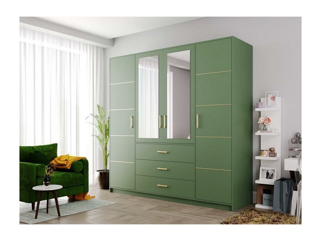 CASA 31004 Šatní skříň 4-dveřová v moderním provedení. Korpus i dvířka jsou z kvalitního LTD v barvě pastelově zelená. Skříň obsahuje praktické zrcadlo. Dveře skříně jsou dekorovány tenkými černými lamelami. Uspořádání polic viz. perokresba. Dodáváme v demontovaném stavu.