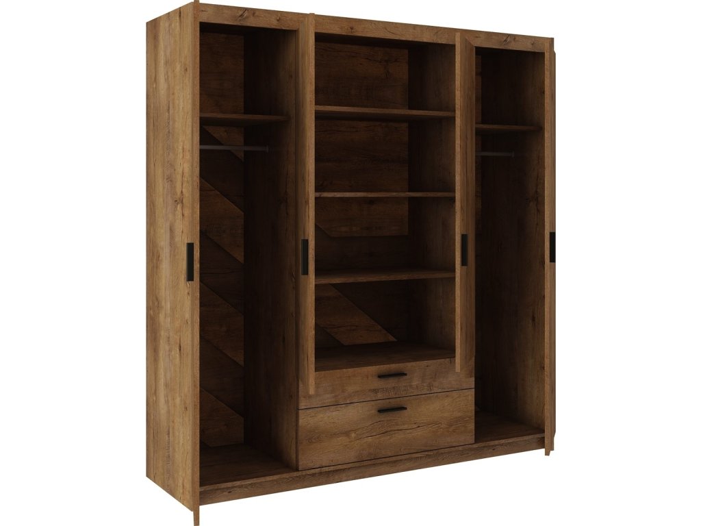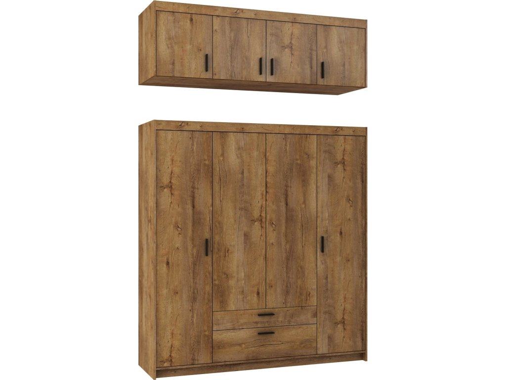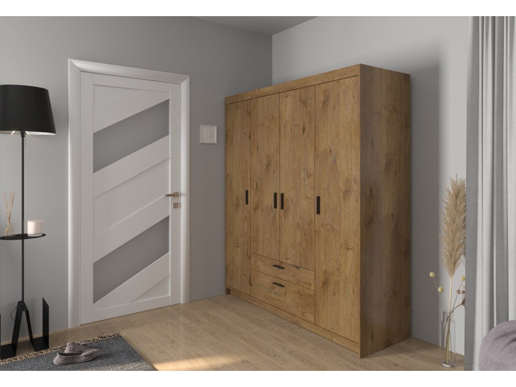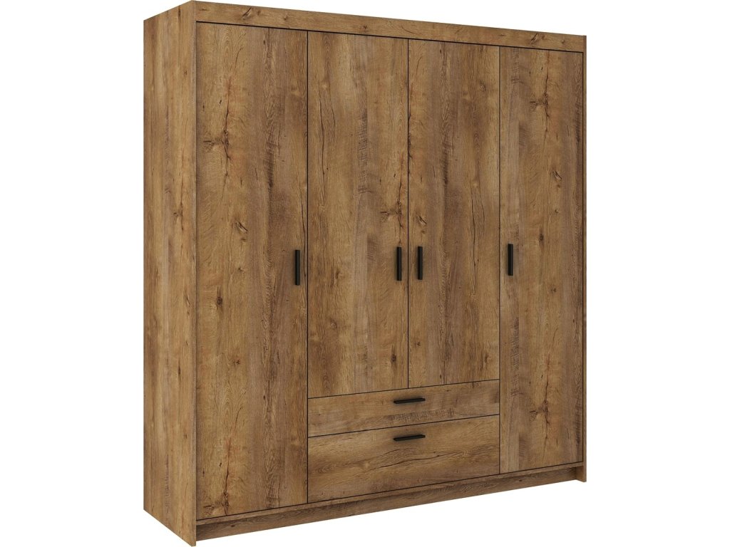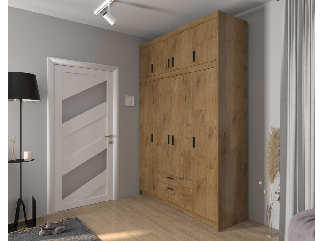 CASA 87002 Šatní skříň ve stylovém, ale velmi praktickém provedení. Nábytek je vyrobený z lamina v barvě dub lefkas. Lamino je odolné proti poškrábání, poškození, vlhkosti a vysokým teplotám. Vnitřní prostor vyobrazen na perokresbě. Možnost dokoupení nádstavce nad skříň. Dodáváme v demontovaném stavu.