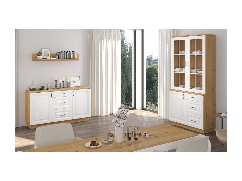 CASA 87016 Šatní skříň třídveřová se dvěma zásuvkami v moderním provedení venkovského stylu. Korpus je vyroben z kvalitního lamina v barvě dub artisan, dvířka a čela zásuvek jsou vyrobena z desky MDF v barvě bílé. Úchyty jsou kovové černé. Rozložení polic a vnitřního uspořádání viz. perokresba. Dodáváme v demontovaném stavu.