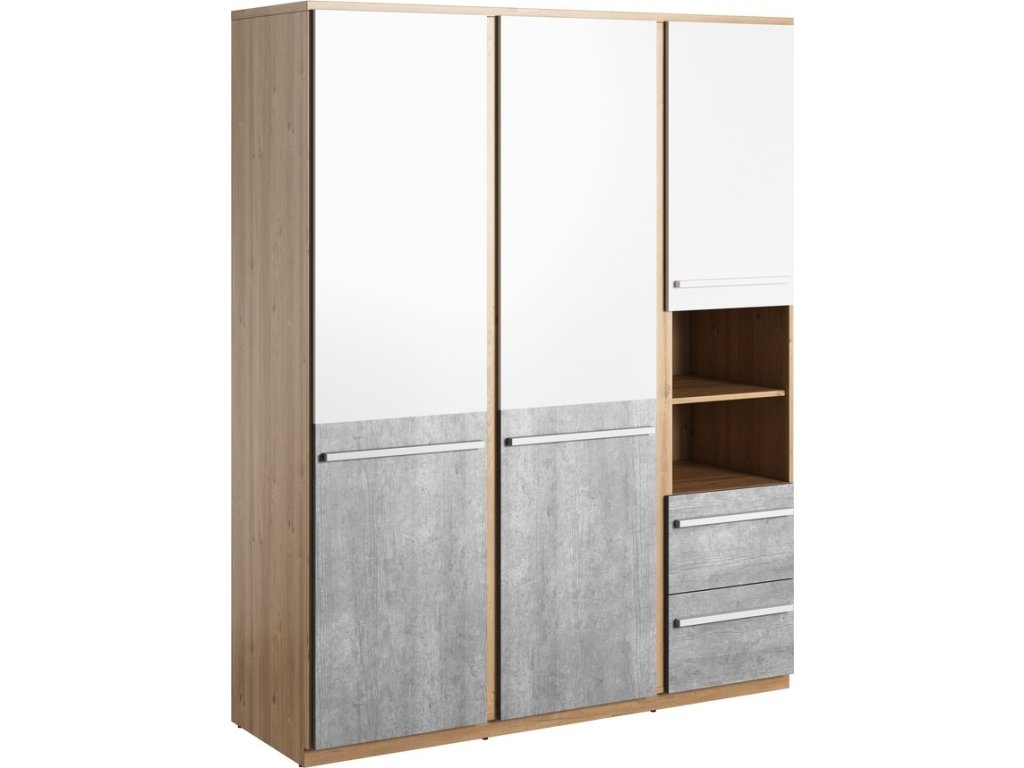 CASA 73034 Šatní skříň třídveřová v moderním stylu. Korpus je vyroben z desky LTD v barvě dub nash, dvířka a čela zásuvek jsou vyrobeny z desky LTD v kombinaci barev šedá/bílá. Uvnitř skříně je šatní tyč a police, ve spodní části jsou dvě zásuvky. Dodáváme v demontovaném stavu.