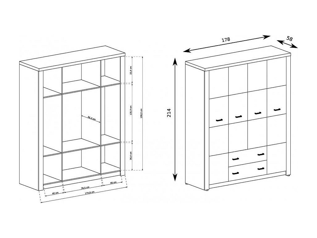 CASA 71007 Kombinovaná šatní skříň ze sektorové řady. Skříň má 4 dveře a 2 zásuvky. V prostření části skříně je uvnitř skříně šatní tyč a nahoře jedna polička. Po bocích jsou skříně s šatní tyčí a poličkou nahoře i dole. Systém je exkluzivní kolekce navržena v moderním duchu. Celá řada se vyznačuje elegancí a jednoduchými tvary, které zaručují plné využití prostoru. Nábytek je vyroben z kvalitního lamina s ABS hrany ( 0,5-0,8 mm ). Barevné provedení jasan bílý. Dodáváme v demontovaném stavu.