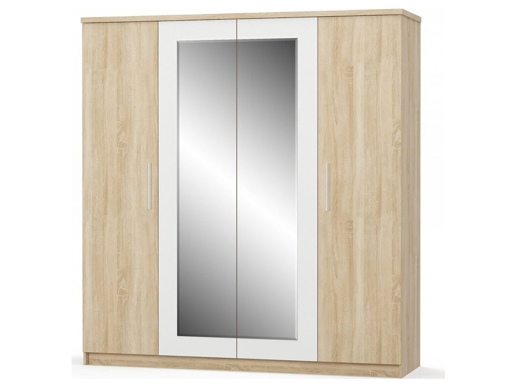 CASA 97004 Šatní skříň čtyřdveřová z ložnicové řady. Moderní provedení v barvě dub sonoma v kombinaci s bílou dokonale doplní váš interiér. Skříň obsahuje praktická zrcadla. Je vyrobena z kvalitní LTD desky. Nabídka komponentů této sektorové řady umožňuje sestavit si nábytek do ložnice nebo studentského pokoje dle vlastních představ. Dodáváme v demontovaném stavu.