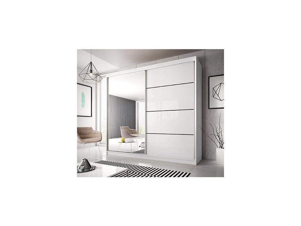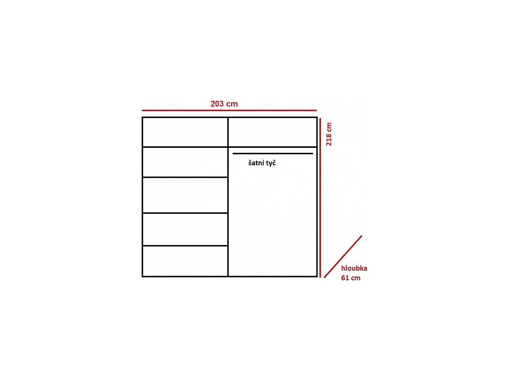 Skříň je vybavena propracovaným policovým systémem, který vám umožní efektivně organizovat oblečení. K dispozici je také závěsná tyč pro kabáty a obleky, což usnadňuje jejich uskladnění. Dalším praktickým prvkem je velké zrcadlo, umístěné na posuvných dveřích, které nejenže opticky zvětší prostor, ale umožní vám snadno zkontrolovat svůj vzhled.