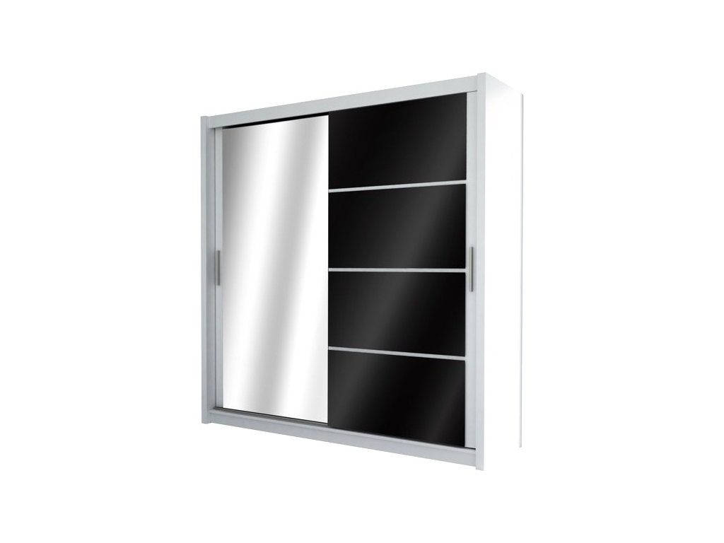 CASA 31010 Šatní skříň s posuvnými dveřmi v moderním provedení. Korpus i dvířka jsou z kvalitního LTD v barvě bílá. Levé dveře mají zrcadlo, pravé černé sklo. Uspořádání polic viz. perokresba. Dodáváme v demontovaném stavu.