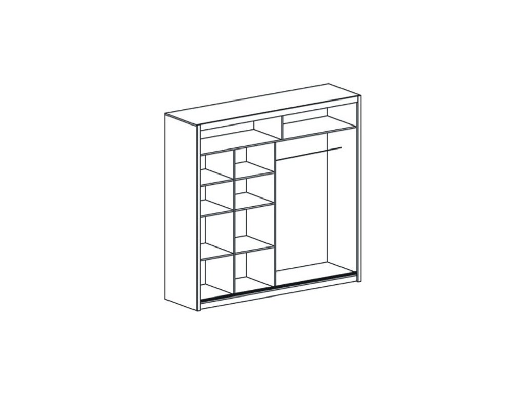 CASA 31058 Šatní skříň s posuvnými dveřmi v moderním provedení. Korpus i dvířka jsou z kvalitního LTD a barevné provedení je bílý mat. Skříň obsahuje praktické zrcadlo. Uspořádání polic viz. perokresba. Dodáváme v demontovaném stavu.
