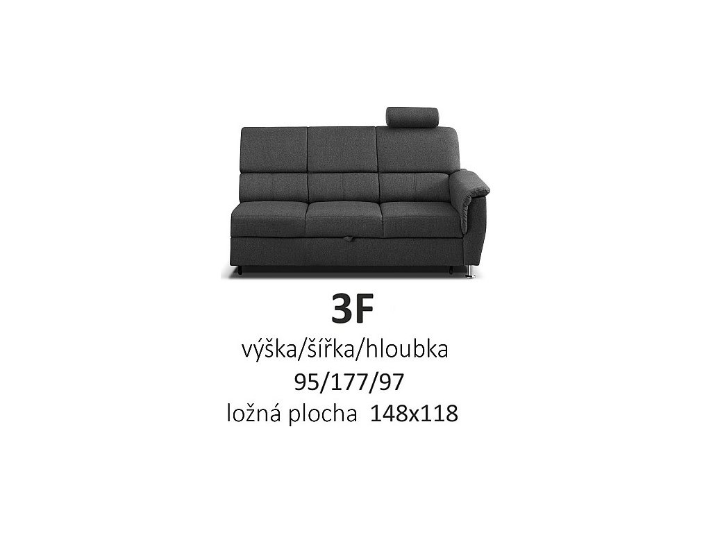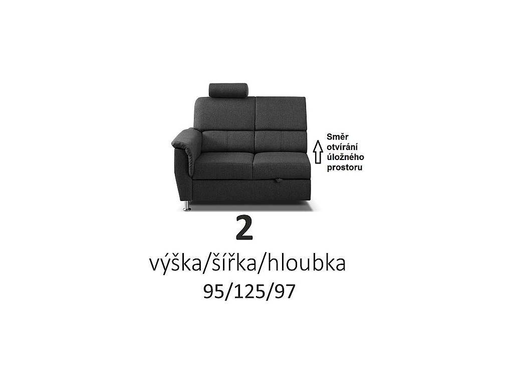 Sedací souprava má polohovatelné opěrky hlavy – záhlavníky, je rozkládací, s úložným prostorem. V sedáku je sendvičová pěna na vlnovci. Chromové nohy o výšce 10 cm. Levá nebo pravé varianta. Rohový díl – funkce pro relax.