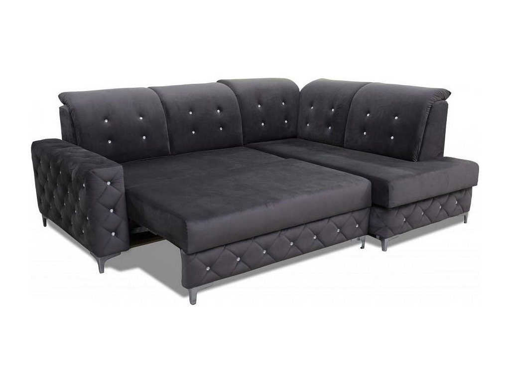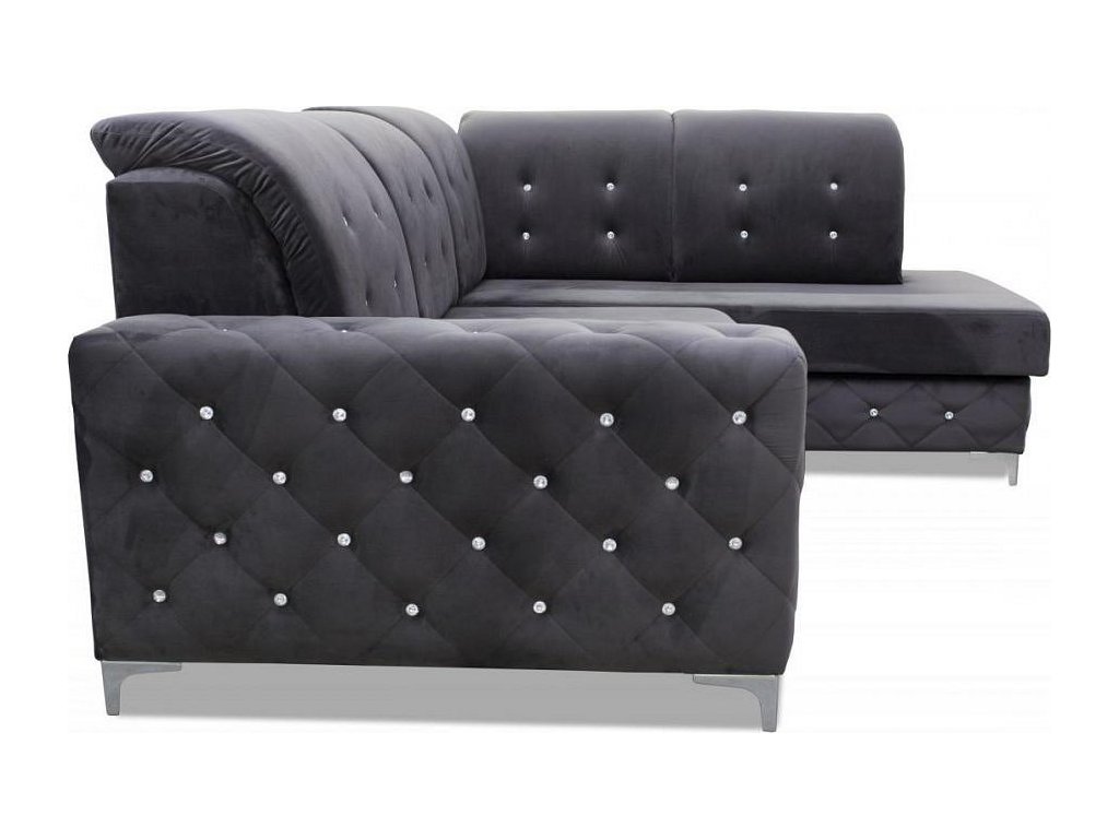 Designová sedací souprava v krásné kombinaci tmavě šedé látky a ozdobného prošití s krystalky.. Sedačka je vyrobena z pružin v kombinaci s kvalitní PUR pěnou. Sedačka je rozkládací s praktickým úložným prostorem. Třpytivé krystalky jí dodávají na jedinečnosti a bude se vyjímat v každém interiéru. Sedací souprava je požena kvalitní potahovou látkou Monolith, která vyniká speciální povrchovou úpravou "Water repellent". Ta chrání povrch textilie před rychlým prosakováním tekutin. Sedací soupravu nabízíme v levém i pravém provedení.
