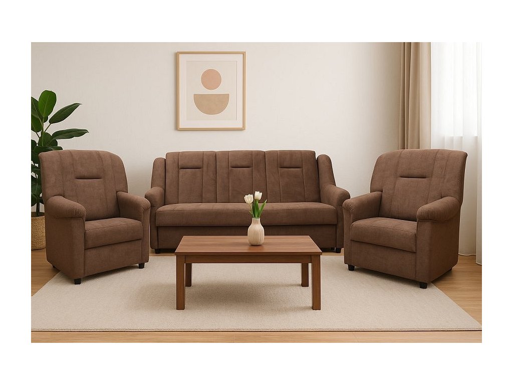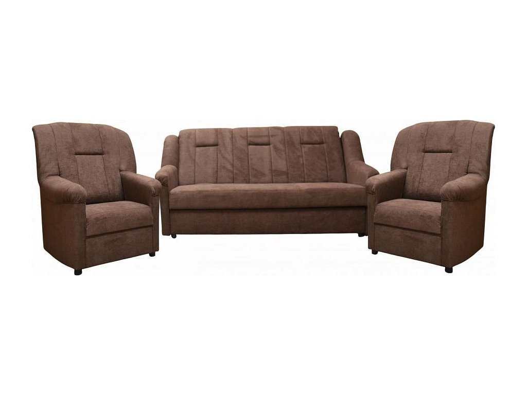 Klasická sedací souprava Panda, je díky svým rozměrům vhodná také do menších pokojů. Sedací souprava je rozkládací a samozřejmostí je i praktický úložný prostor. Jednoduchým rozložením pomocí systému "klik klak", vznikne lůžko vhodné k příležitostnému spaní. Sedací souprava je potažena kvalitní potahovou látkou. Sedací soupravu nabízíme v několika barevných provedeních, takže si určitě vyberete tu pravou pro Váš útulný obývací pokoj.