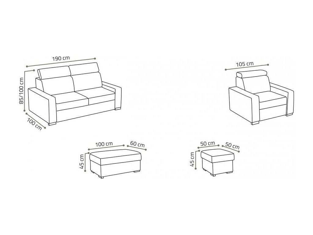 Rozměry trojsedu: 190 x 100 cm křeslo: 105 x 100 cm