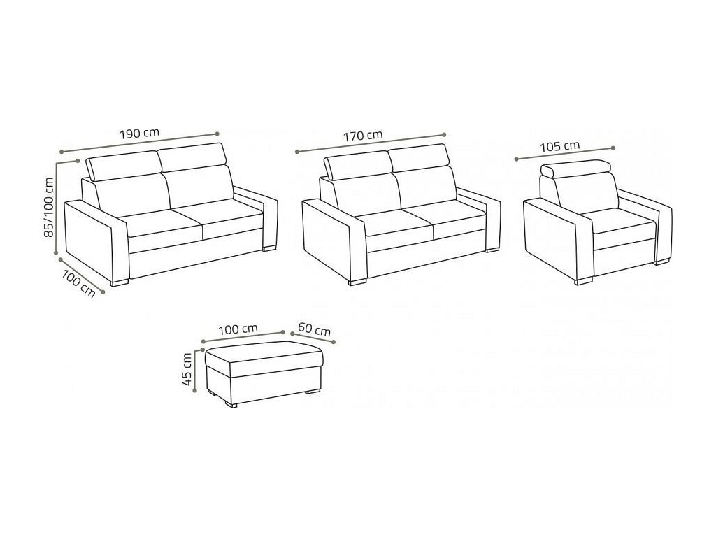 Rozměry trojsedu: 190 x 100 cm dvojsedu: 170 x 100 cm křesla: 105 x 100 cm taburet s úložným prostorem: 100 x 60 cm