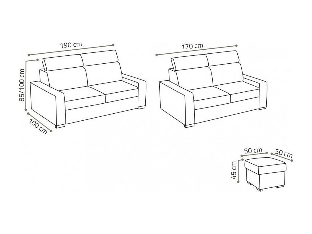 Rozměry trojsedu: 190 x 100 cm dvojsedu: 170 x 100 cm taburet: 50 x 50 cm