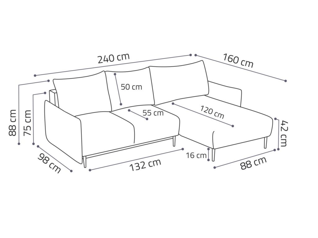 Sedací souprava Santino je vyrobena v jednoduchém elegantním designu, který se hodí do všech interiérů. Její velkou předností je univerzální možnost sestavení. Tzn. že podle potřeby můžete mít levou nebo pravou stranu, což je výhoda při zařizování obývacího pokoje. Nemusíte přemýšlet do jakého rohu sedací soupravu postavíte a jednoduše si ji podle potřeby přizpůsobíte. Sedací souprava je rozkládací. Jednoduchým rozložením vytvoříte dostatečně velké lůžko k příležitostnému přespání Vaší návštěvy. Samozřejmostí je i praktický úložný prostor, který můžete využít např. na lůžkoviny. Sedací souprava je potažena kvalitní látkou Velo, která je vyrobena z vysoce kvalitní příze, je extrémně měkká a příjemná na dotek. Látka je odolná před pronikáním vlhkosti a tekutin, snadno se čistí a udržuje v perfektním stavu. Výplň sedáků tvoří kombinace vlnitých pružin s kvalitní HR pěnou. Pro pohodlí při sezení a odpočinku, je sedací souprava vybavena 3 objemnými polštáři. Správná barva potahové látky je zobrazena na první a druhé fotografii. Ostatní fotografie jsou pouze ilustrační.