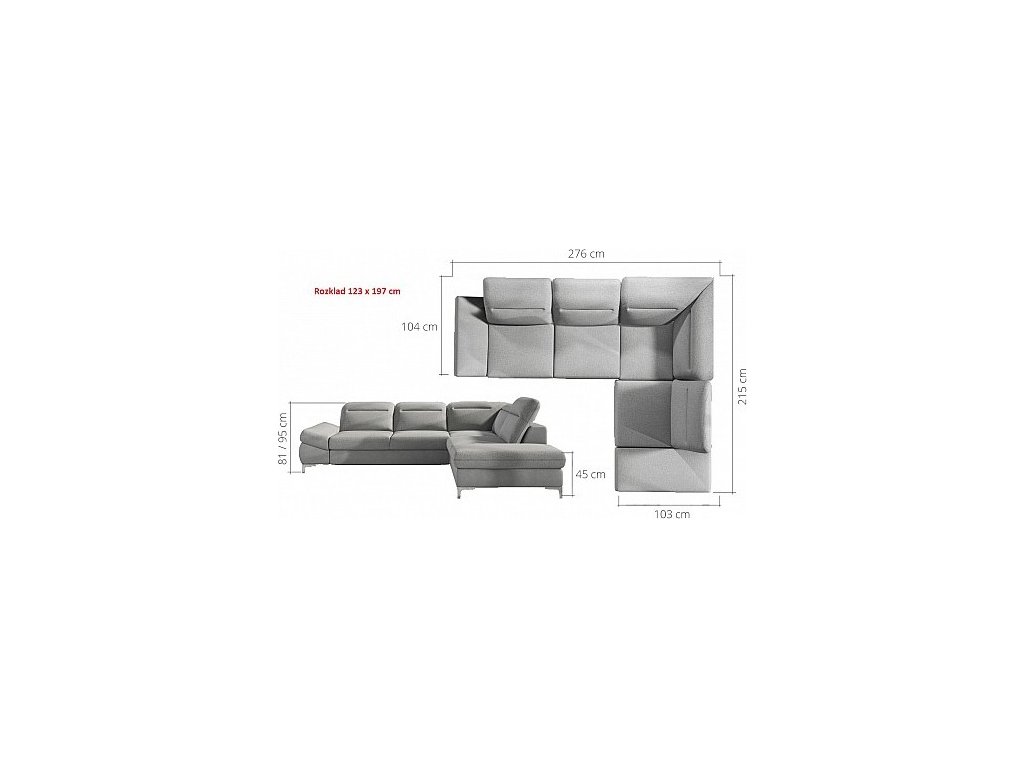 K dispozici je v levé nebo pravé variantě a v kombinaci látek Jasmine 100 pro korpus a Evolution 19 pro sedací část, které zaručují vysokou kvalitu a odolnost.