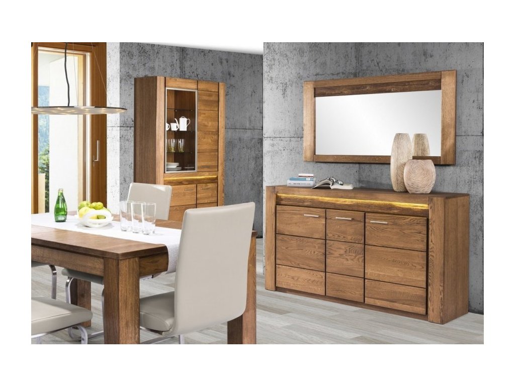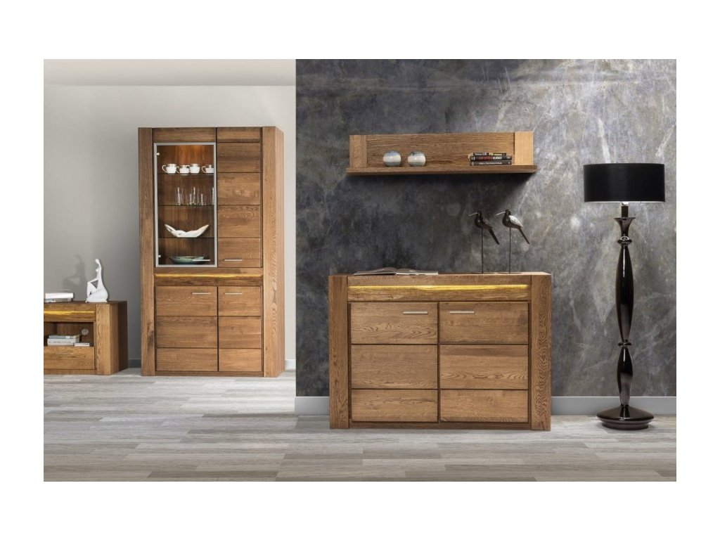 CASA 75034 Sekretář s barem. Sekretář má 5 dvířek a 1 výklop, LED osvětlení vitrín lze dokoupit. Vsazením osvětlení do ozdobné rýhované lišty, které je v ceně, je zvýrazněn rustikální vzhled masivního dřeva. Celá řada se vyznačuje elegancí a jednoduchými tvary, které zaručují plné využití prostoru. Nábytek je v barvě dub rustical, vyroben z kvalitního masivního dřeva, korpusy vnitřní jsou z lamina, korpusy vnější jsou z přírodní dýhy. Elegantní úchyty jsou z kovu. Dodáváme ve smontovaném stavu.