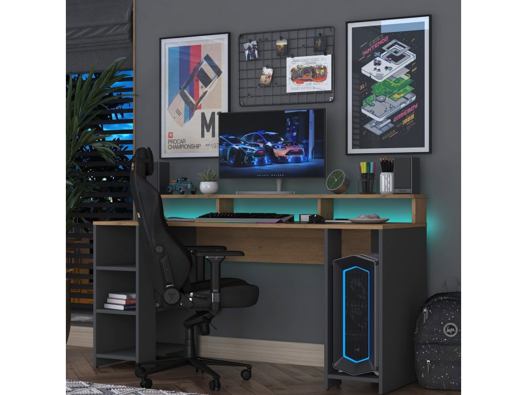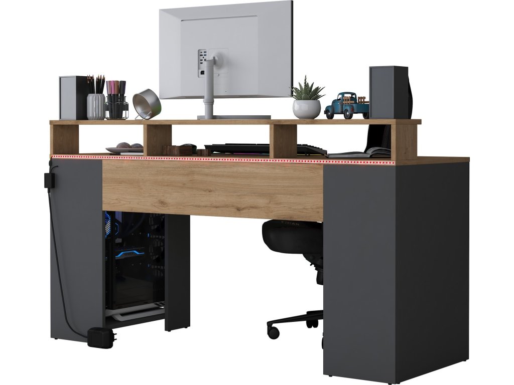 Stůl poskytuje dostatek prostoru pro pohodlnou práci, studium nebo hraní. Díky integrovanému kontejneru na PC a praktickému regálku budete mít vše potřebné po ruce a přitom udržovat pracovní prostor organizovaný. Odolné materiály, jako je melamin a VT laminát, zajišťují snadnou údržbu a dlouhou životnost.