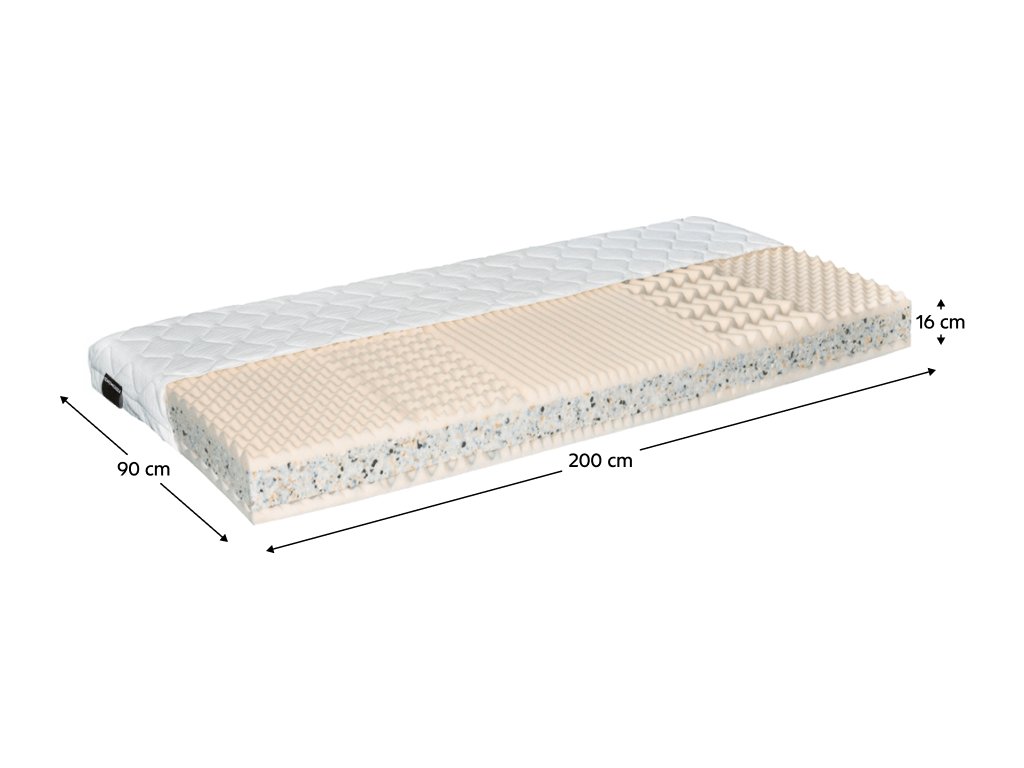 maximální prodyšnost pěny a odvod vlhkosti, použití oboustranné,možné použití na pevnou podložku o polohovatelný rošt, nosnost matrace je 120 kg, výška matrace 16 cm, rozměr matrace: 90x200 cm,