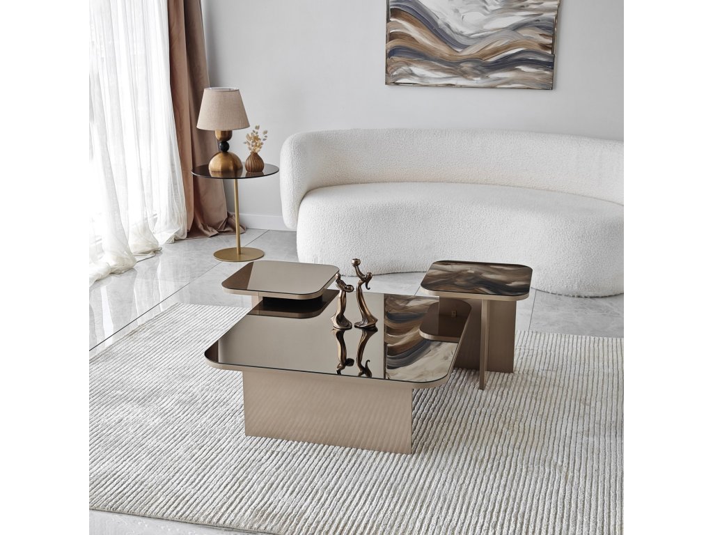 Set konferenčních stolků nabízí elegantní řešení pro váš obývací pokoj. Díky kombinaci béžové a bronzové barvy a modernímu designu vynikne v každém interiéru a zároveň poskytne vysokou funkčnost.