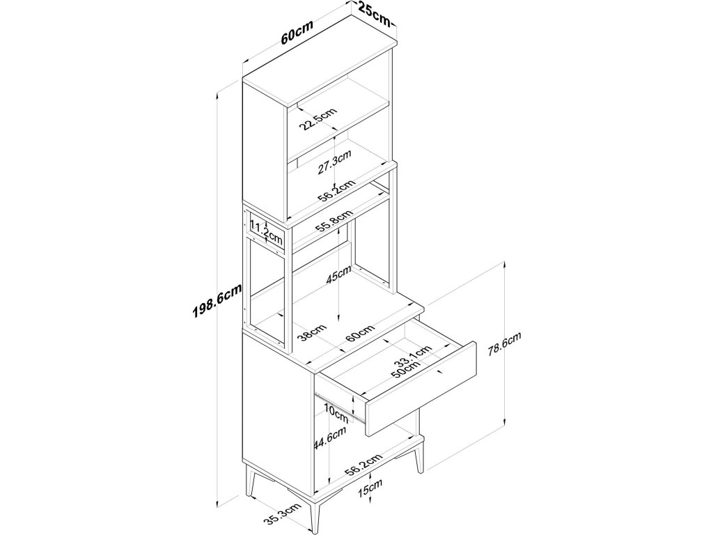 Skříň nabízí dostatek prostoru pro uložení kuchyňských potřeb, nádobí nebo drobností díky kombinaci čtyř plných dvířek, zásuvky a otevřeného regálku. Horní část je ideální pro umístění mikrovlnné trouby nebo dalších spotřebičů, zatímco zbývající úložný prostor udrží vaši kuchyň uspořádanou.
