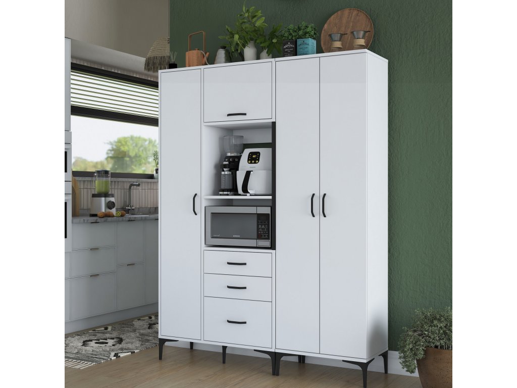 Skříň je vybavena čtyřmi plnými dvířky, třemi zásuvkami a regálkem, který poskytuje praktický prostor pro mikrovlnnou troubu nebo jiné spotřebiče. Její víceúčelový design zajišťuje dostatek místa pro uložení kuchyňských potřeb, nádobí a dalších předmětů.