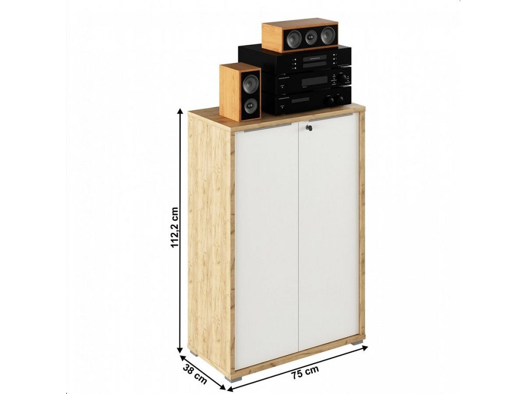 Skříň RIOMA TYP 09 Barevné provedení: dub artisan / bílá Materiál: DTD laminovaná Rozměry (ŠxHxV): 75x38x112,2 cm Tloušťka materiálu:16/22 mm Dvoudveřová Zámek je na dvířkách Se zámkem Dodávané v demontu