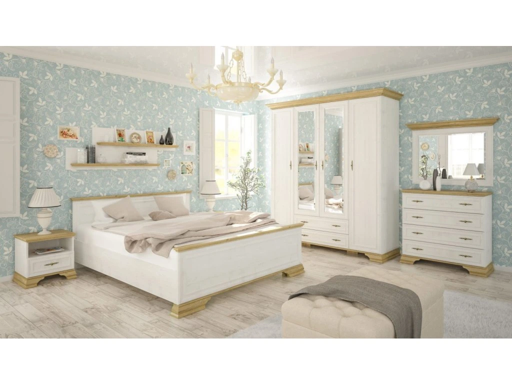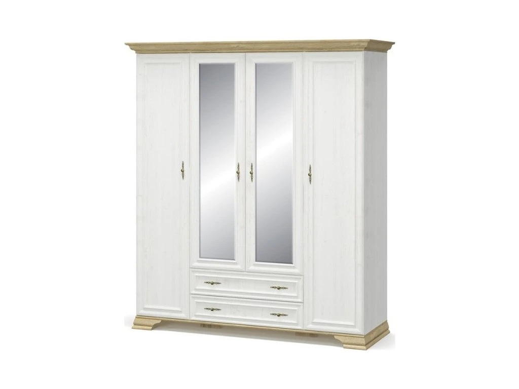 CASA 97011 Šatní skříň se 4 dvířky, 2 zásuvkami a se zrcadlem ze sektorové řady nábytku v romantickém stylu. Nábytek je vyroben z kvalitní LTD v kombinaci s MDF v barevné kombinaci borovice andersen/zlatý dub. V naší nabídce najdete další jednotlivé prvky tohoto nábytku, ze kterého si můžete zařídit obývací pokoj dle vlastních potřeb. Dodáváme v demontovaném stavu.
