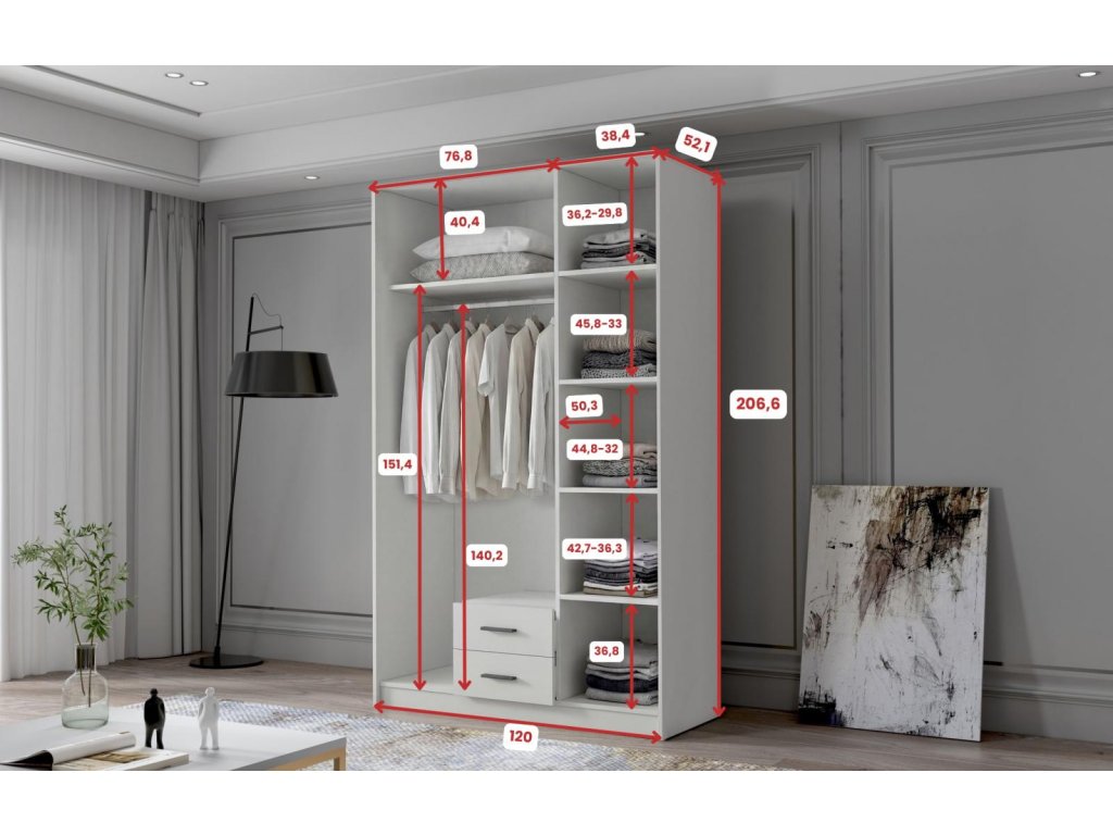 Šatní skříň Arya II v moderním designu má šířku 120 cm a je rozdělena na dvě praktické části. Vnitřní uspořádání kombinuje závěsnou tyč, pět polic a 2 šuplíky, což umožňuje přehledné a praktické rozdělení šatníku.