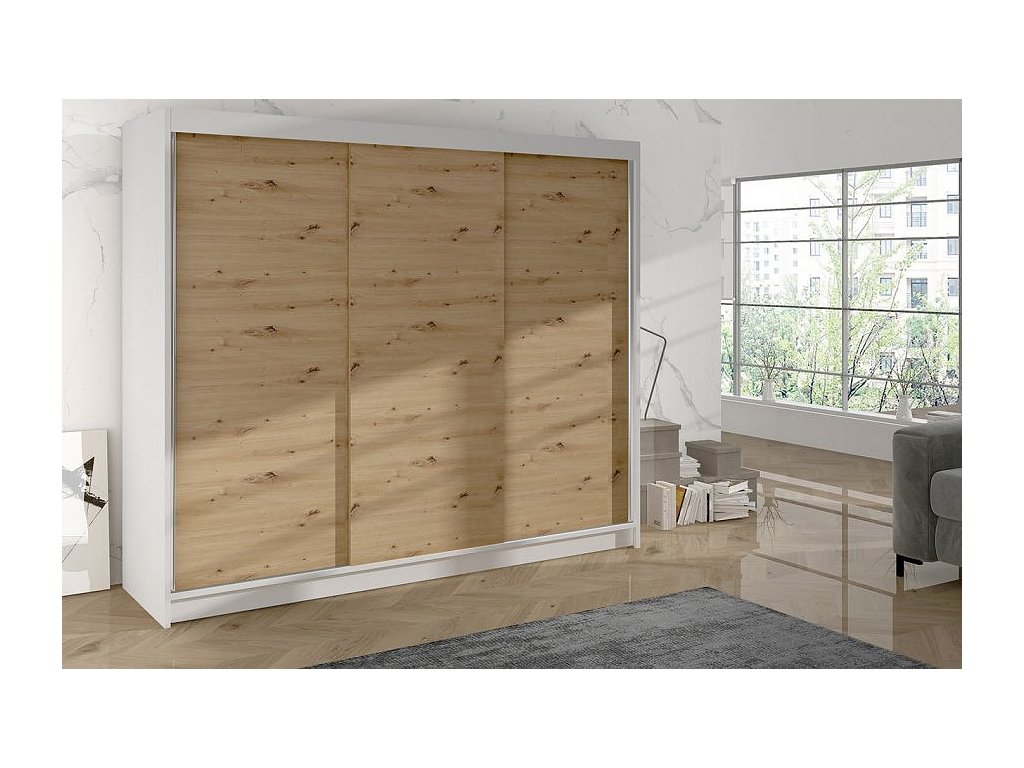 Korpus i dveře jsou vyrobeny z odolné 16 mm laminované desky s ABS hranami, které zajišťují dlouhou životnost. Posuvné dveře se hladce pohybují po hliníkových vodicích lištách. Skříň je dostupná v několika atraktivních barevných provedeních, takže ji snadno sladíte s ostatním nábytkem.