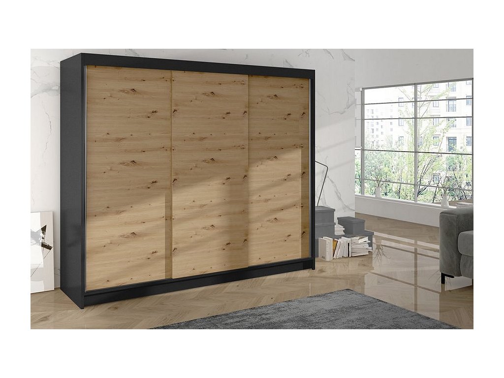 Korpus i dveře jsou vyrobeny z odolné 16 mm laminované desky s ABS hranami, které zajišťují dlouhou životnost. Posuvné dveře se hladce pohybují po hliníkových vodicích lištách. Skříň je dostupná v několika atraktivních barevných provedeních, takže ji snadno sladíte s ostatním nábytkem.