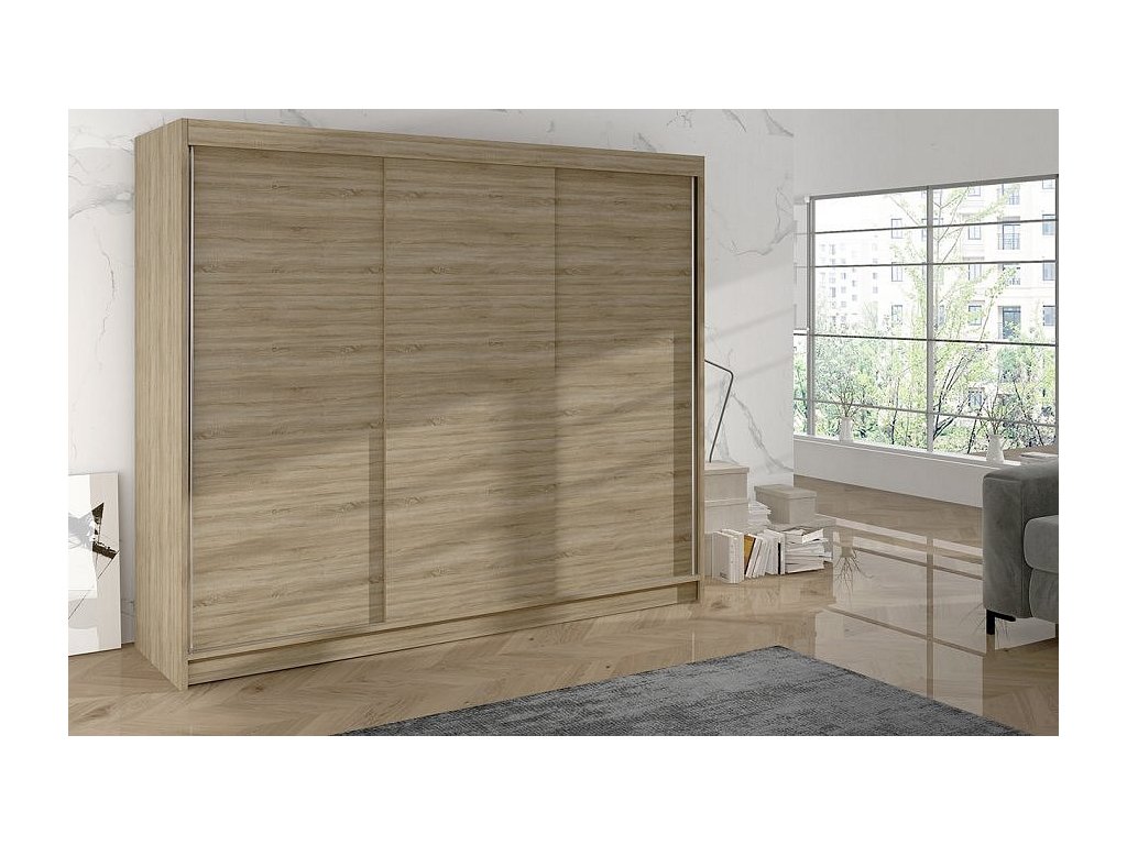 Korpus i dveře jsou vyrobeny z odolné 16 mm laminované desky s ABS hranami, které zajišťují dlouhou životnost. Posuvné dveře se hladce pohybují po hliníkových vodicích lištách. Skříň je dostupná v několika atraktivních barevných provedeních, takže ji snadno sladíte s ostatním nábytkem.