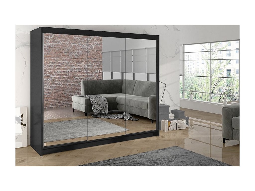 Šatní skříň Debora III v moderním designu má šířku 200 cm a je rozdělena na tři praktické části. Posuvné dveře šetří místo a usnadňují přístup do interiéru. Vnitřní uspořádání kombinuje závěsnou tyč a devět polic, což umožňuje přehledné a praktické rozdělení šatníku.