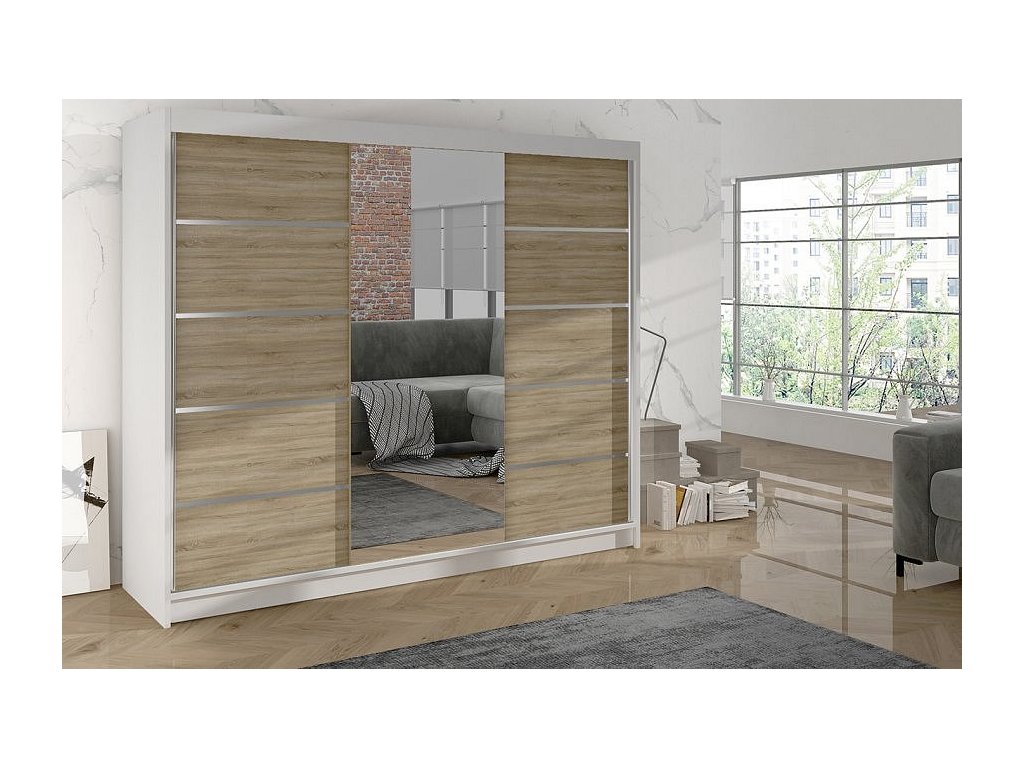 Korpus i dveře jsou vyrobeny z odolné 16 mm laminované desky s ABS hranami, které zajišťují dlouhou životnost. Posuvné dveře se hladce pohybují po hliníkových vodicích lištách. Skříň je dostupná v několika atraktivních barevných provedeních, takže ji snadno sladíte s ostatním nábytkem.