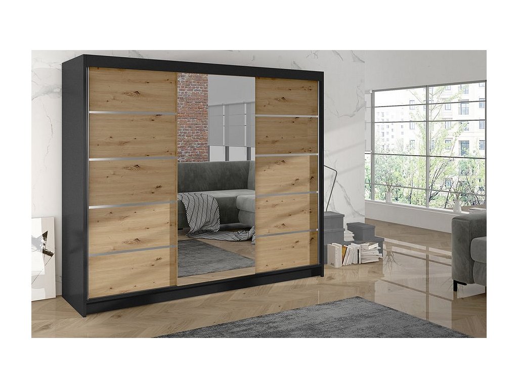 Šatní skříň Debora VI v moderním designu má šířku 200 cm a je rozdělena na tři praktické části. Posuvné dveře šetří místo a usnadňují přístup do interiéru. Vnitřní uspořádání kombinuje závěsnou tyč a devět polic, což umožňuje přehledné a praktické rozdělení šatníku.