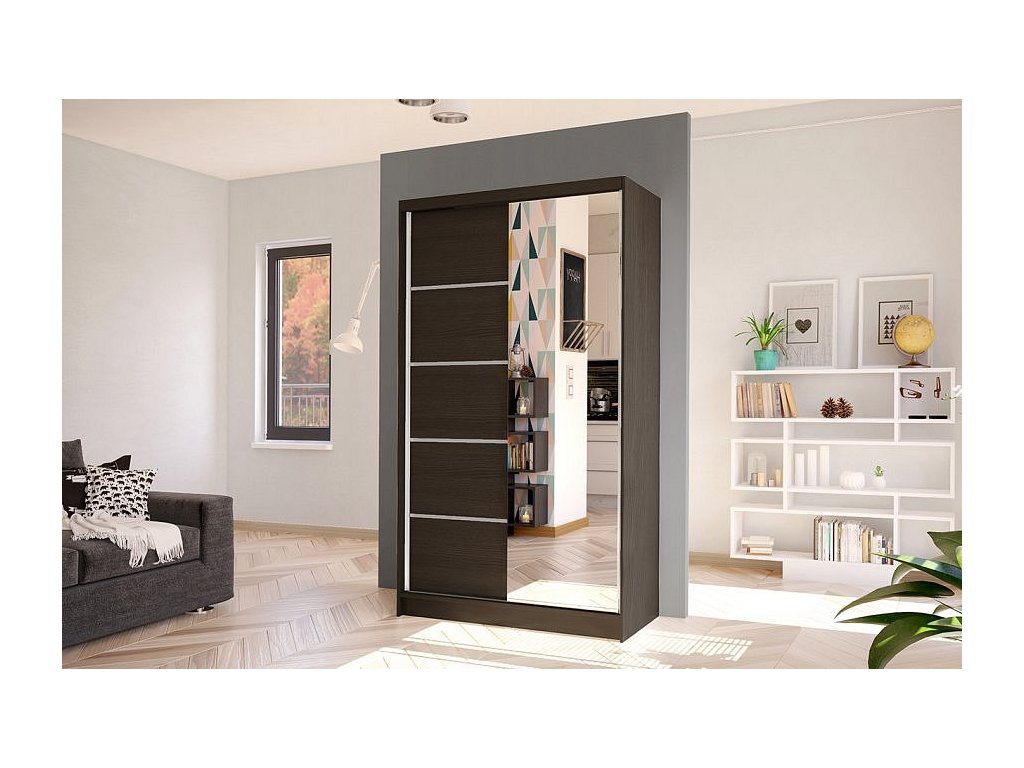 Šatní skříň Diem III v moderním designu má šířku 100 cm a je rozdělena na dvě praktické části. Posuvné dveře šetří místo a usnadňují přístup do interiéru. Vnitřní uspořádání kombinuje závěsnou tyč a čtyři police, což umožňuje přehledné a praktické rozdělení šatníku.