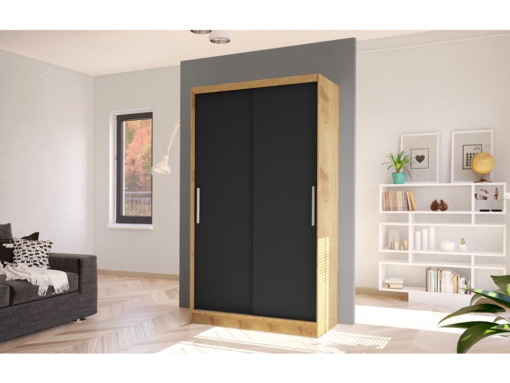 Šatní skříň Diem IV v moderním designu má šířku 100 cm a je rozdělena na dvě praktické části. Posuvné dveře šetří místo a usnadňují přístup do interiéru. Vnitřní uspořádání kombinuje závěsnou tyč a čtyři police, což umožňuje přehledné a praktické rozdělení šatníku.