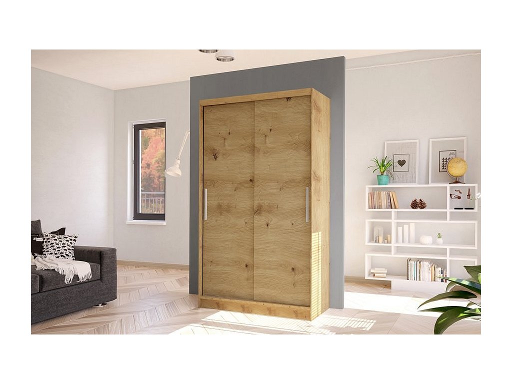 Šatní skříň Diem IV v moderním designu má šířku 100 cm a je rozdělena na dvě praktické části. Posuvné dveře šetří místo a usnadňují přístup do interiéru. Vnitřní uspořádání kombinuje závěsnou tyč a čtyři police, což umožňuje přehledné a praktické rozdělení šatníku.