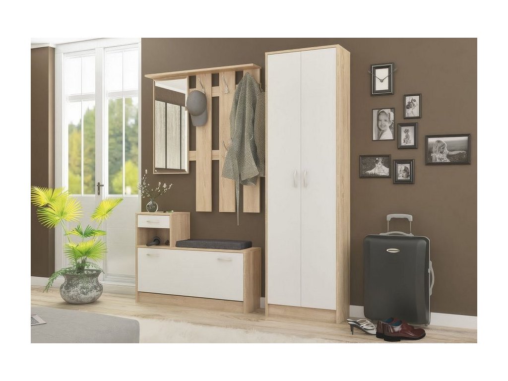 CASA 97010 Moderní šatní skříň vyrobena z kvalitní laminátové desky v barevné kombinaci dub sonoma/bílá. Ke skříni lze dokoupit věšákovou stěnu se zrcadlem a poličkou a malým výklopným botníkem s poličkou a zásuvkou ve stejném barevném provedení a zařídit si tak stylovou předsíň s dostatkem úložného prostoru. Dodáváme v demontovaném stavu.