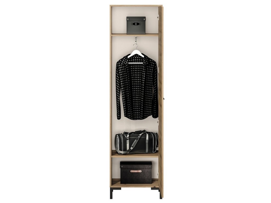 CASA 56014 Šatní skříň jednodveřová je vyrobena z desky LTD v barvě dub artisan. Dvířka je možné namontovat na pravou nebo levou stranu. Úchyty jsou plastové. Možnost dokoupení dalších segmentů. Dodáváme v demontovaném stavu.