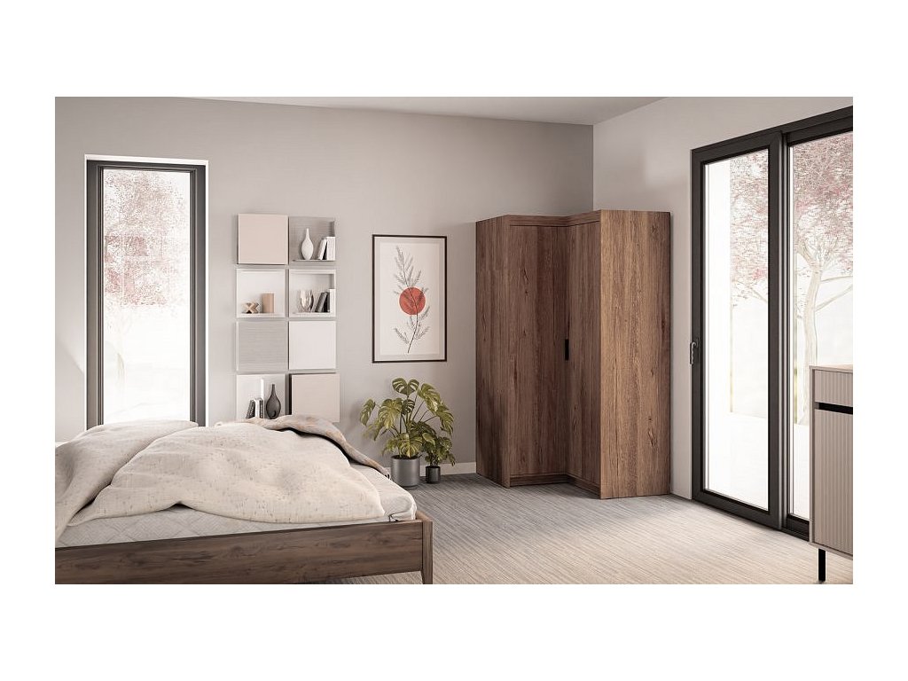 Rohová šatní skříň Enja je vyrobena z kvalitního lamina tl.15 mm, které je odolné a snadné na údržbu. Vnitřní uspořádání skříně je praktické a poskytuje dostatek úložného prostoru. Své uplatnění najde v ložnici, předsíni i v dětském pokoji. Ke skříni lze dokoupit nádstavec. Skříň je dodávaná v demontu a nabízíme ji ve několika barevných provedeních. Součástí balení je montážní plánek včetně všech potřebných spojovacích materiálů.