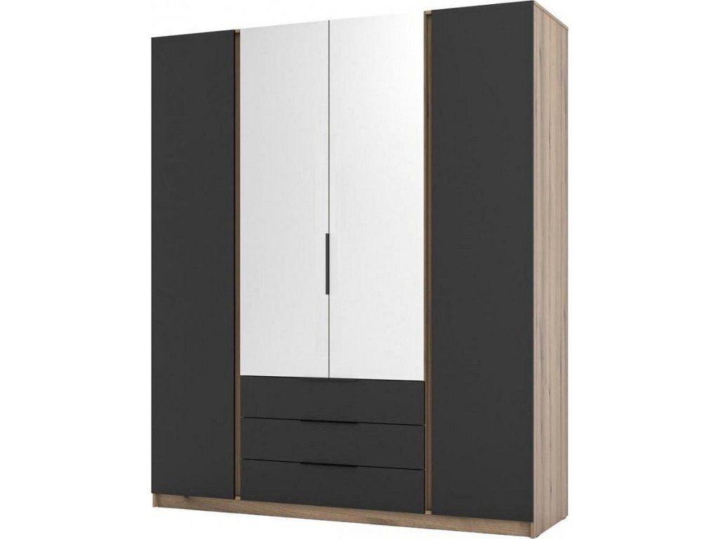 Šatní skříň Keny III v moderním designu má šířku 200 cm a je rozdělena na tři praktické části. Vnitřní uspořádání kombinuje závěsnou tyč, 11 polic a 3 šuplíky, což umožňuje přehledné a praktické rozdělení šatníku.