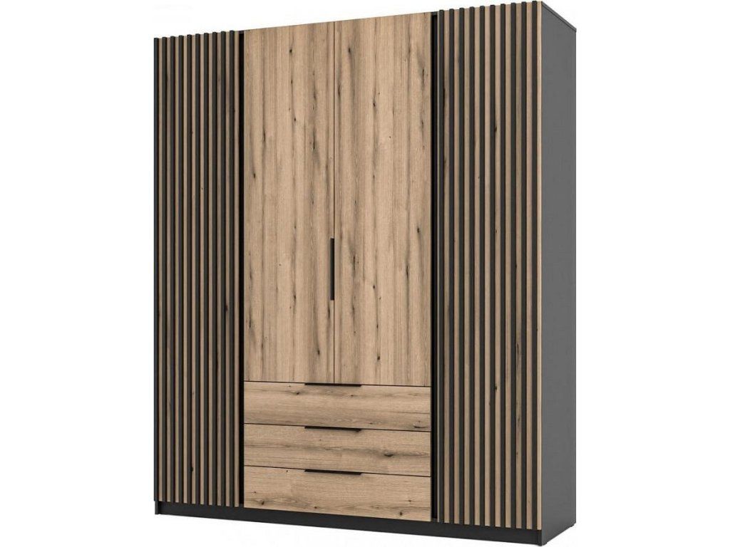 Šatní skříň Keny IV v moderním designu má šířku 200 cm a je rozdělena na tři praktické části. Vnitřní uspořádání kombinuje závěsnou tyč, 11 polic a 3 šuplíky, což umožňuje přehledné a praktické rozdělení šatníku.