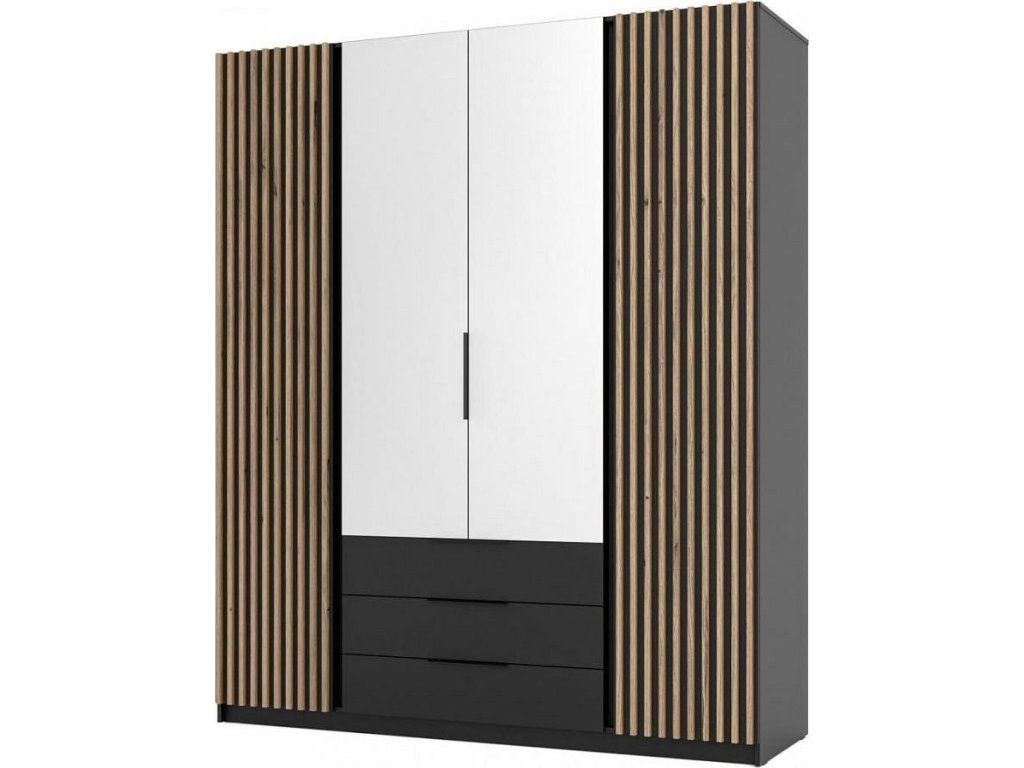 Šatní skříň Keny V v moderním designu má šířku 200 cm a je rozdělena na tři praktické části. Vnitřní uspořádání kombinuje závěsnou tyč, 11 polic a 3 šuplíky, což umožňuje přehledné a praktické rozdělení šatníku.