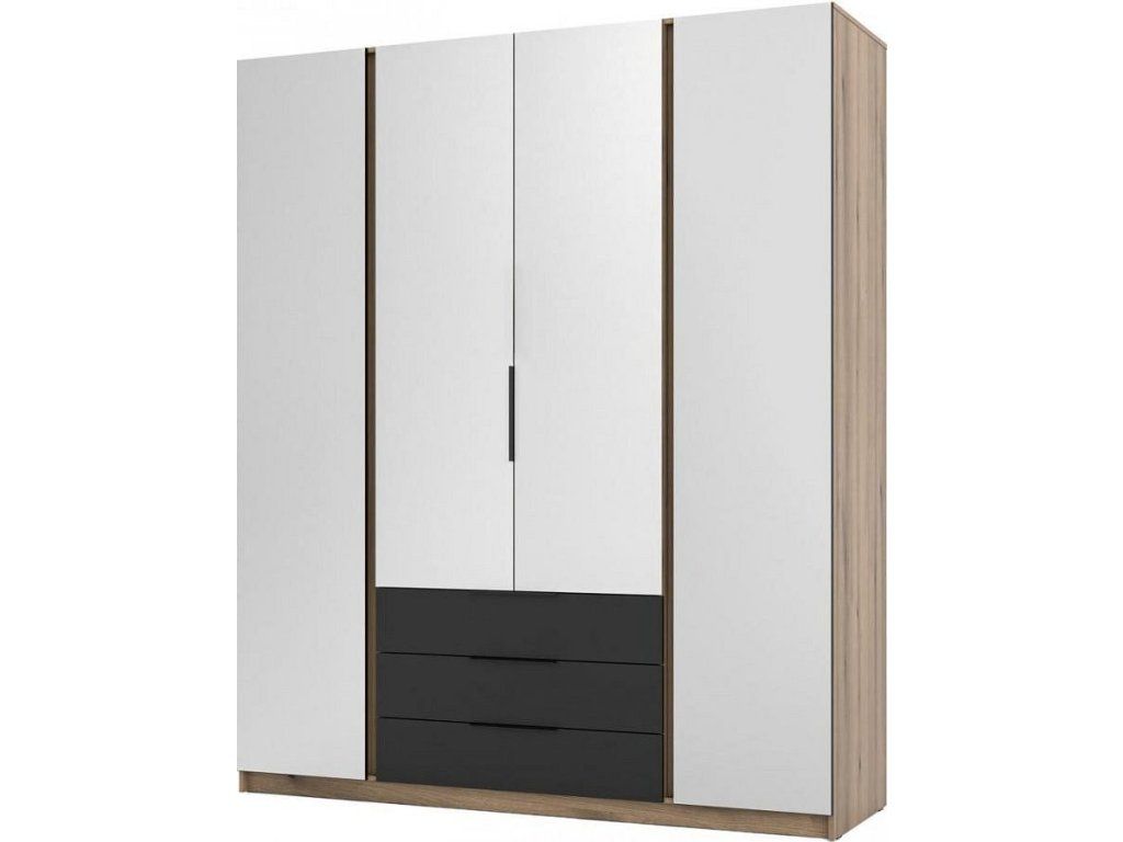 Šatní skříň Keny VI v moderním designu má šířku 200 cm a je rozdělena na tři praktické části. Vnitřní uspořádání kombinuje závěsnou tyč, 11 polic a 3 šuplíky, což umožňuje přehledné a praktické rozdělení šatníku.