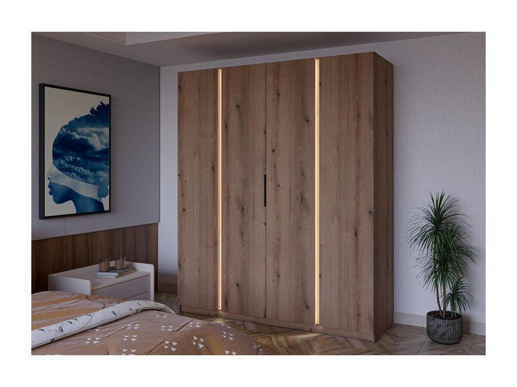 Šatní skříň Keny VII v moderním designu má šířku 200 cm a je rozdělena na tři praktické části. Vnitřní uspořádání kombinuje závěsnou tyč a 11 polic, což umožňuje přehledné a praktické rozdělení šatníku.