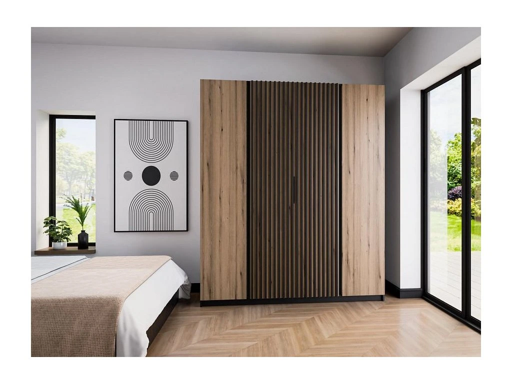 Šatní skříň Keny XIII v moderním designu má šířku 200 cm a je rozdělena na tři praktické části. Vnitřní uspořádání kombinuje závěsnou tyč a 11 polic, což umožňuje přehledné a praktické rozdělení šatníku.